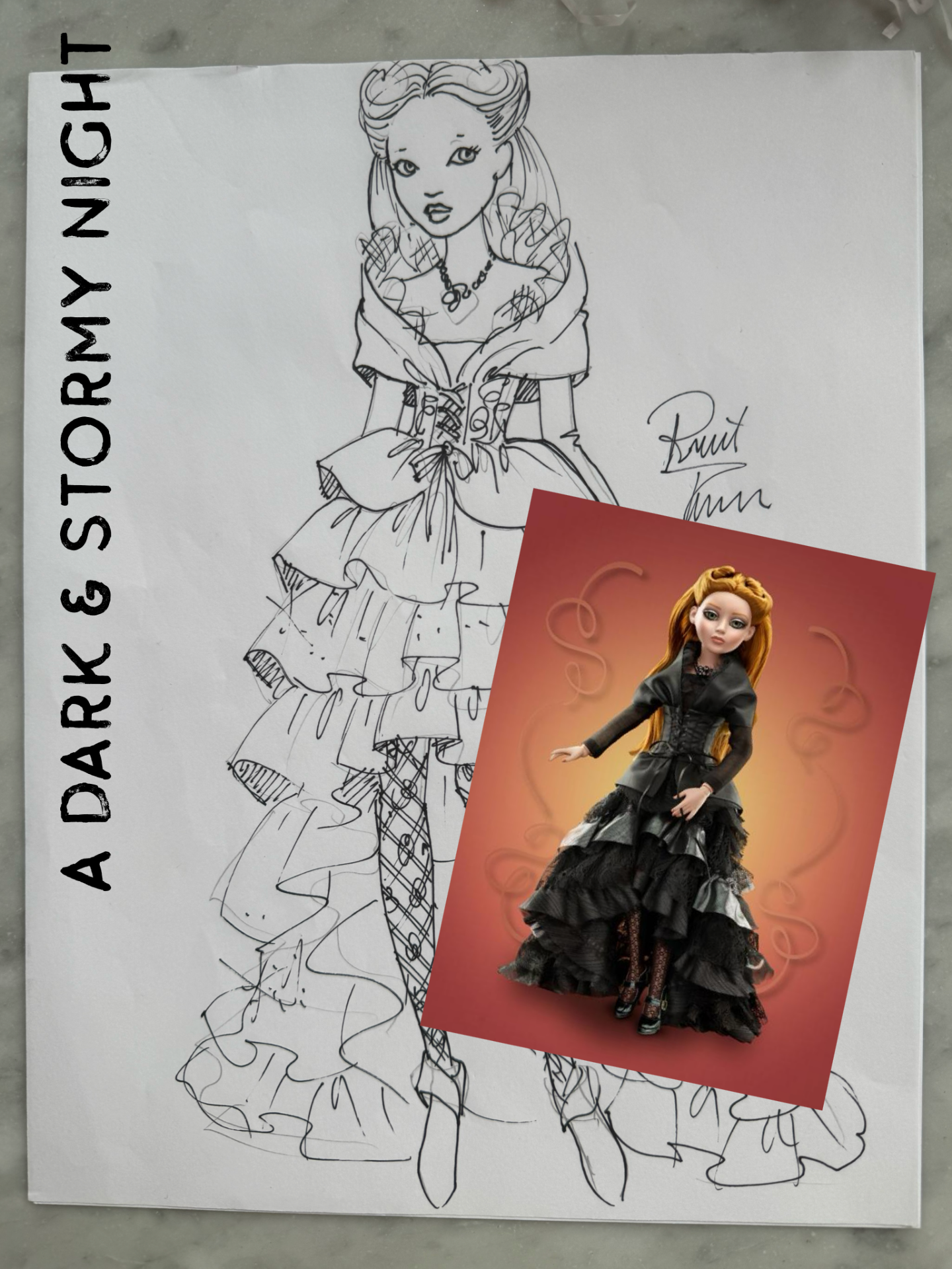 the original one of a kind sketch by artist Robert Tonner used to create in 2011. This doll had MPN: #010113. . -- inset graphic shows the doll as completed... this sketch measured 8.5x11, it is signed and will be sent in a cello sleeve... note post it with style notes is incuded and can be removed or placed on back for framing