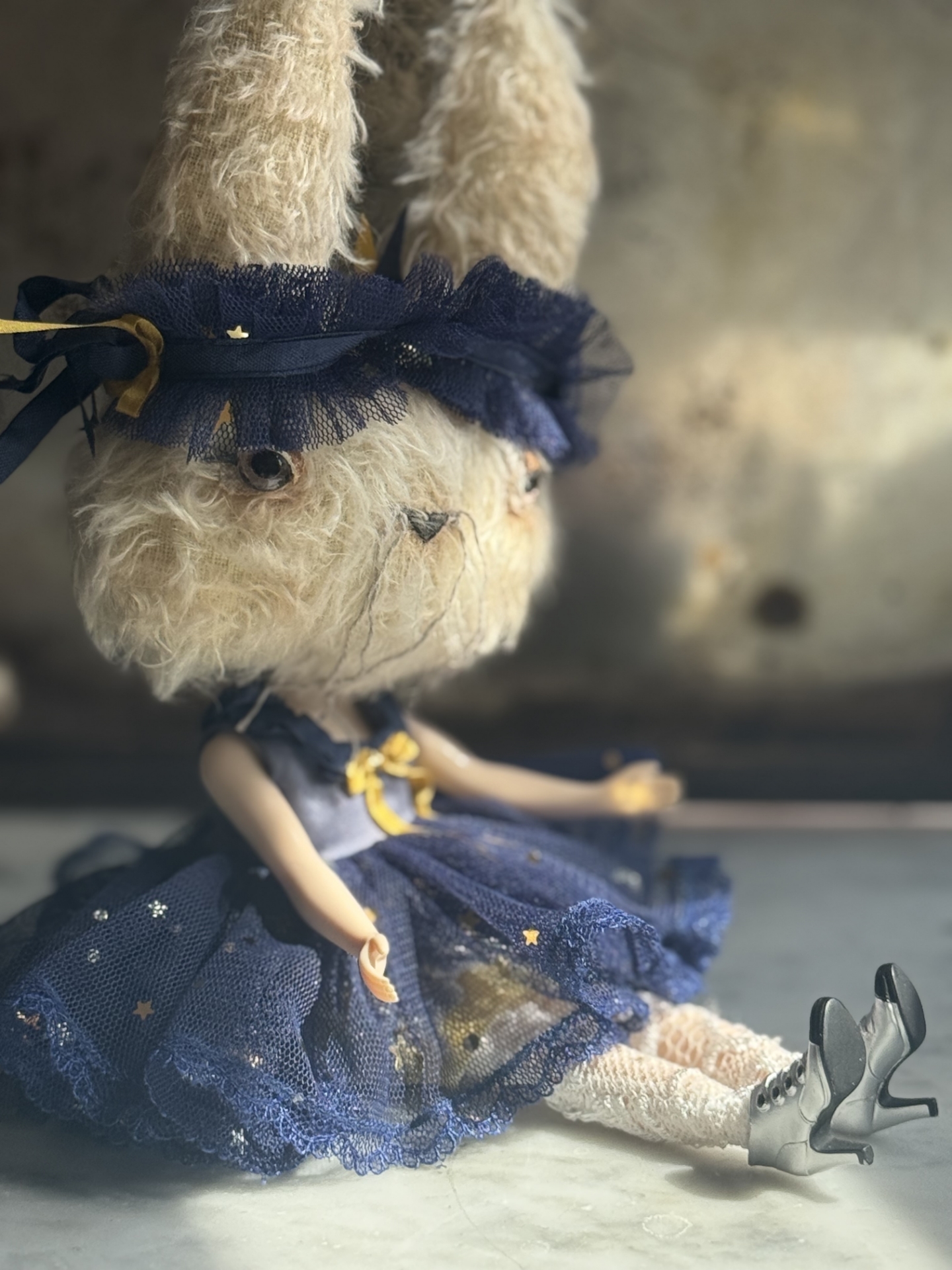 ...an incredible Bunny girl!!! A one of a kind created by artist Letty Worley, this bunny dolly is done with a STOCK/AUTHENTIC/TAKARA Blythe body. About 14" tall to the top of her ears. She has a mohair head and wears a wonderful ensemble by some of our favorite dolls' dressmakers. This Bunny Blythe is priced sold with the outfit she wears in the images (fluffy dress, lacey stockings, silver boots, and a wonderful headband that can also be worn as a collar) She can also be changed to wear and enjoy all Neo Blythe clothing.