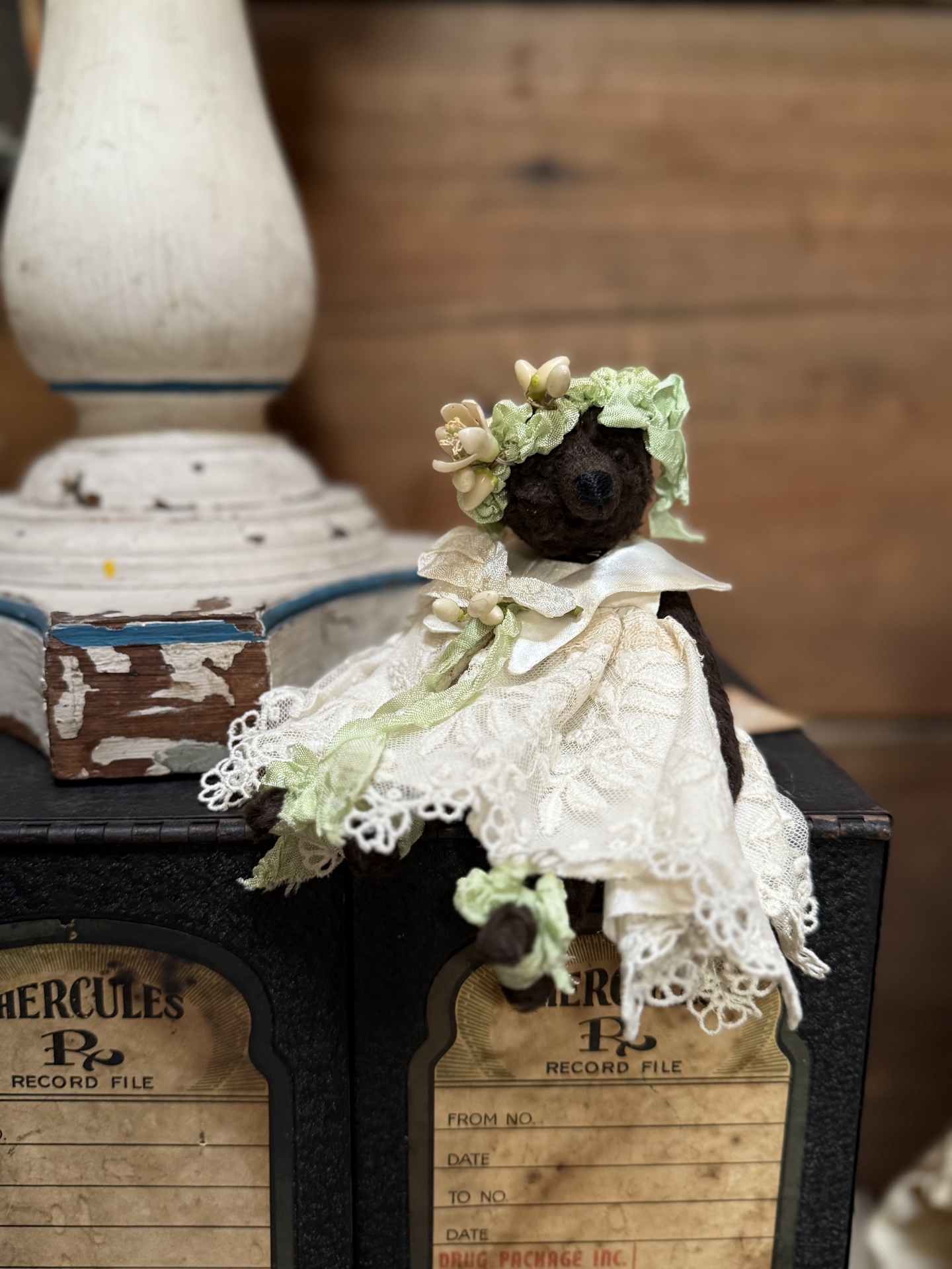 a wonderful one of a kind ted measuring about 6.5" inches tall, crafted from a dark chocolate viscose this deaire has black glass eyes. Her ffrock is made of antique lace dress lined with silk and a matching sailor collar and a headpiece of vntage millinery and antique wax flowers and buds, with a matching corsage on her silk collar. She is heavily weighted with steel shot she is lovely and tactile and she has ballent ribbon tied feet. A rare find and so special from this talented English artist, Judy Fellows. Creted in 2025 she comes with her signed hang tag.