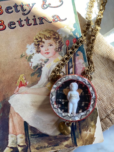 Wearable altered art pendant created with a melange of found and vintage objects, ephemera, antique findings convey texture and style, a 2.25" pendant hangs from an 18" chain, overall length measures 20.25” created by artist Dara DiMagno, singular in style and story, her work has been featured by Country Living, Romantic Homes and Where Women Create Magazines, WAS $165, NOW featured as a SALE item… TWO SIDED