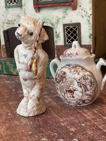 ...a sweet and charming snow pal...quite special -long retired standing about 6.5" and holding a fishing pole of his fresh catch... created in CA at Debbee's studio...molded and hand painted...