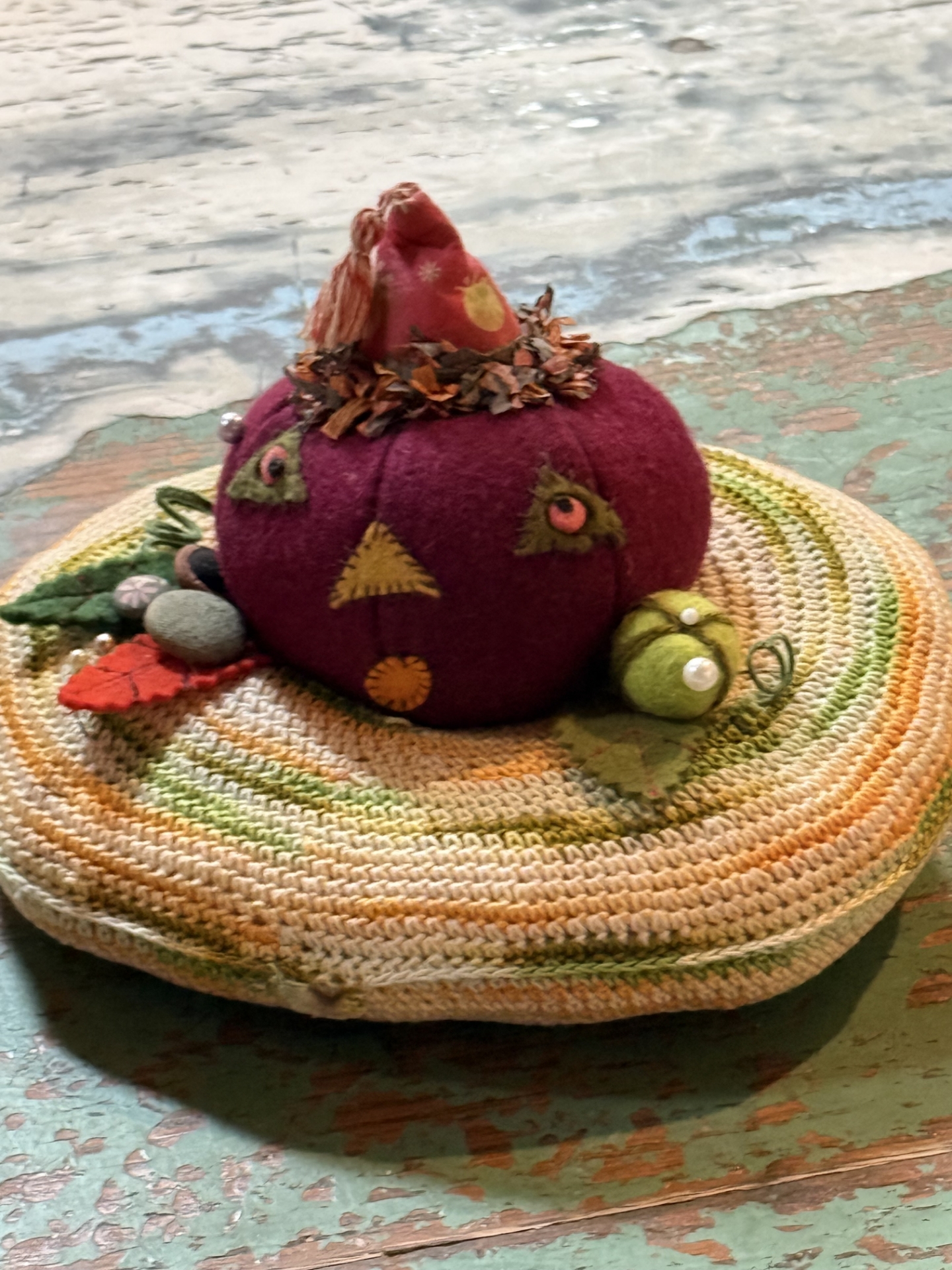 A charming one of a kind woolen pumpkin tops a pin keep -- really wonderful in use or display - by heirloom teddy bear artist, Pat Murphy of Murphy Bears. Measures about 8" across and 5" tall ” -- with vintage fabrics and findings, and old millinery blooms, quite wonderful, WAS $148, NOW ON SALE