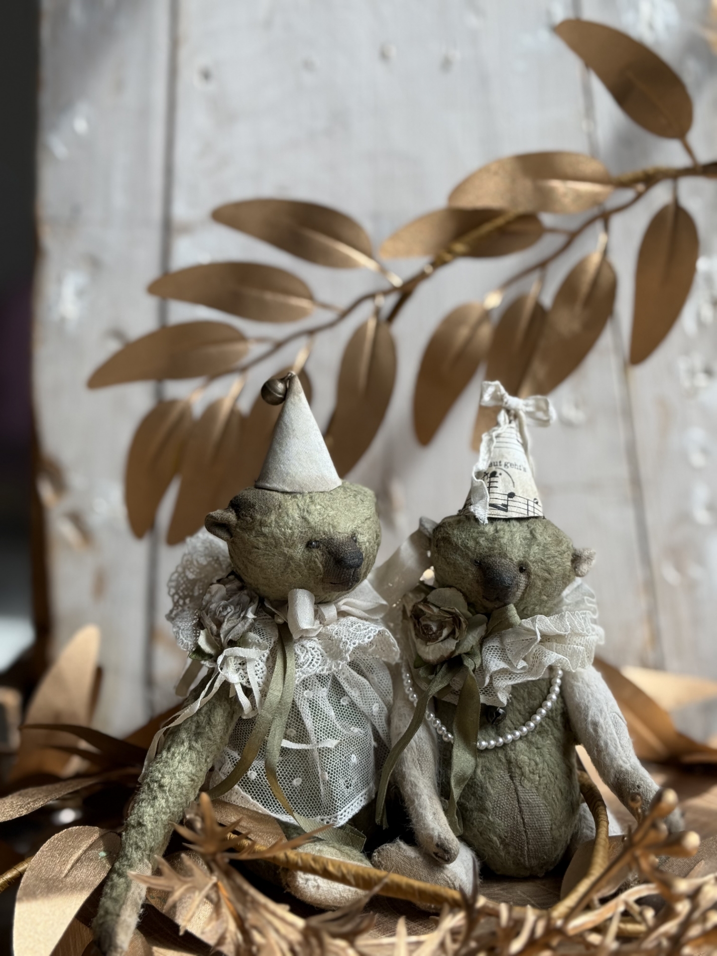 Oh my! What an incredible teddy girl -- so lovely with her fine linen with vintage flourishes and lush and dainty details - created by artist Ingrid Schmid about 7.5”, jointed, made from aged mohair, wearing a fine frock and helmet (removable)... #4 in an edition of 5 (her companions are available separately)