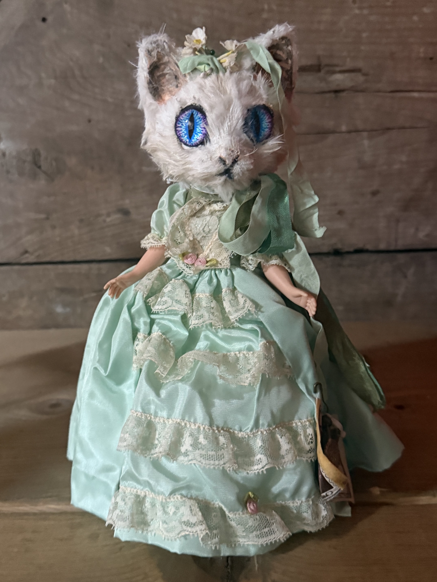 compelling and winsome, she carries a bouquet of vintage millinery blooms tied with lace... an anthropomorphic kitty available at Earth Angels Sutdios allery... exceptional, oddly sweet, and evocative of a special type of whimsy and imagination...a wonderful one of a kind...