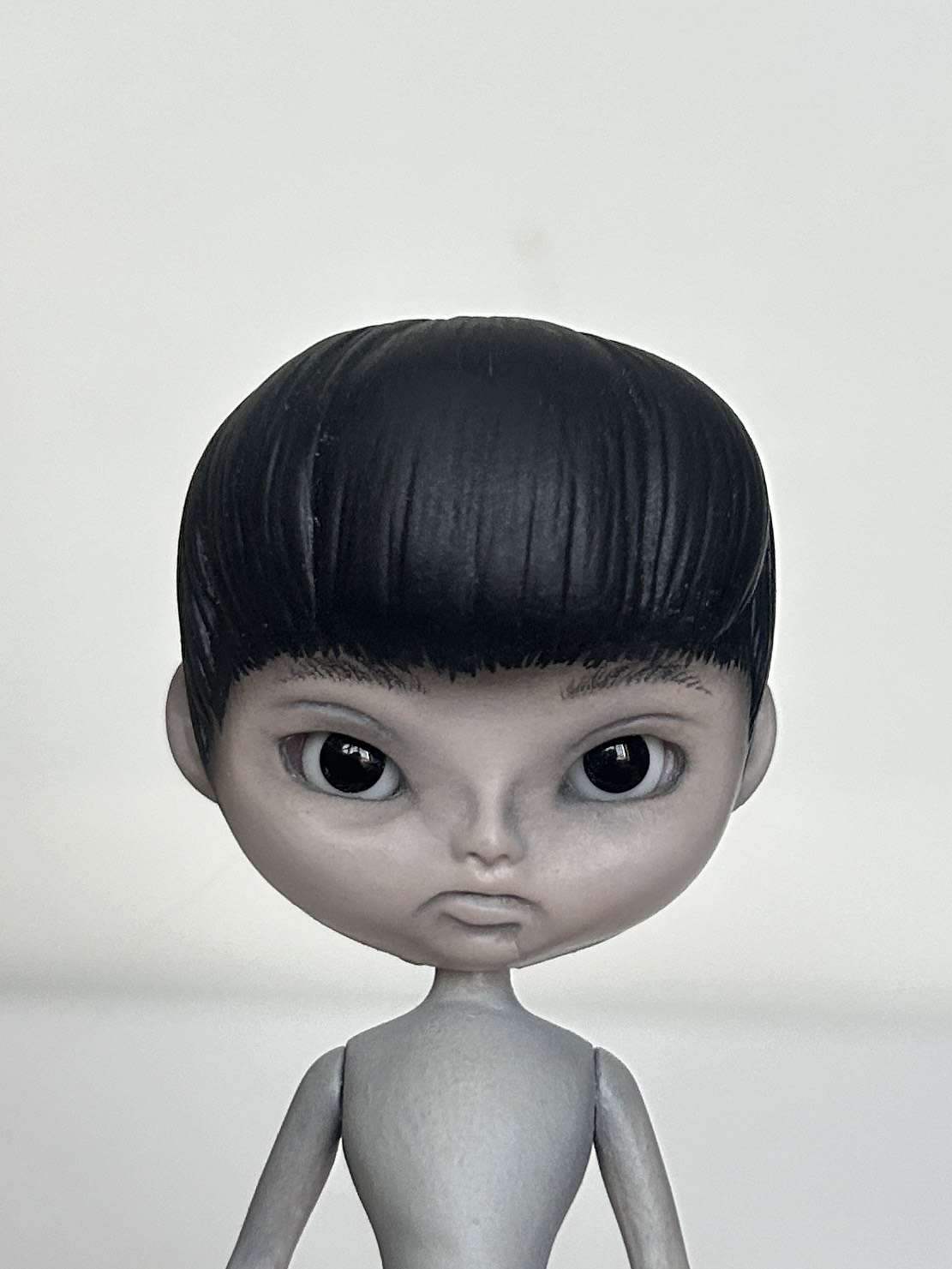 A one of a kind petite art doll offering by Drexler, this amazingly detailed creation is a tiny work of art. A hand sculpted Petite Blythe doll measuring 4.5". Created with the artist's signature style and an homage to a ghosty character - done on a stock petite Blythe base. He comes packed in a special custom box. Available exclusively at Earth Angels Studios by special arrangement. WAS $550 now avaialable at promo price