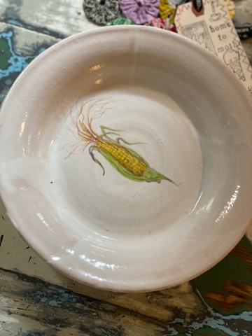 ... lovely low soup bowl measures about 9" in diameter... beautiful in use or display... art potery...wheel thrown, slip dipped and decorated with lush Faience painting... made by renown California artist, Julie Whitmore. Her work is recognized for its highly textured, naive form… a rustic folk art piece… one of a kind of course