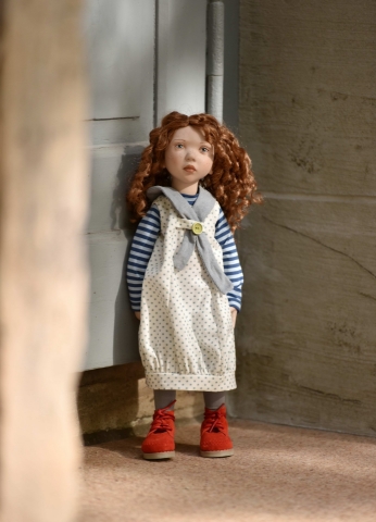 NEW for 2023 - a wonderful girl from the Junior collection of talented artist Nicole Marschollek-Menzner of Zwergnase Dolls, she stands 19.5" or 50cm. She has a vinyl body and her lush wig is Kanekalonwig -- the best quality syntetic fibers from Japan. Her face is lovingly hand-painted. Vinyl colour: porcelain - She wears a wonderful color coordinated and festive ensemble with real leather shoes and well tailored details. Made in Germany....emblem branded canvas toggle bag come with her...there will be a delay in shipping as she will be ordered for you