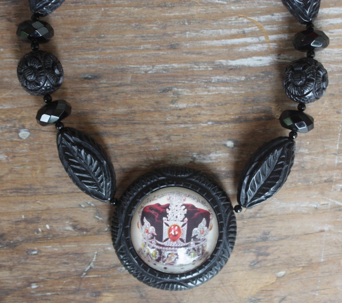 what a crown, regal graphic meets chunky bead, tumbled resin beads add style and swing, image under bubble, 16” (with 2” silver extender to 18”) pendant measures 2", created in San Francisco by Hotcakes Design, WAS $104, NOW on SALE... $78