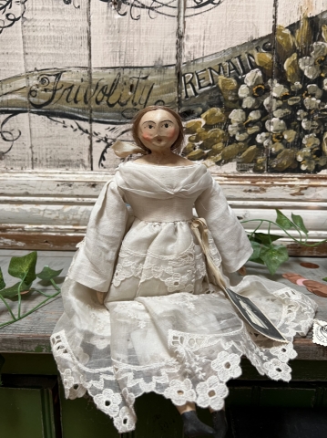 truly lovely….a one of a kind art doll created by artist Nicole Sayre, this lovely hand made creation measures about 13” nd is laden with charming detail, finely done attire in all antique textiles with an amazing skirt, she is lovingly trimmed with vintage elements and ephemera