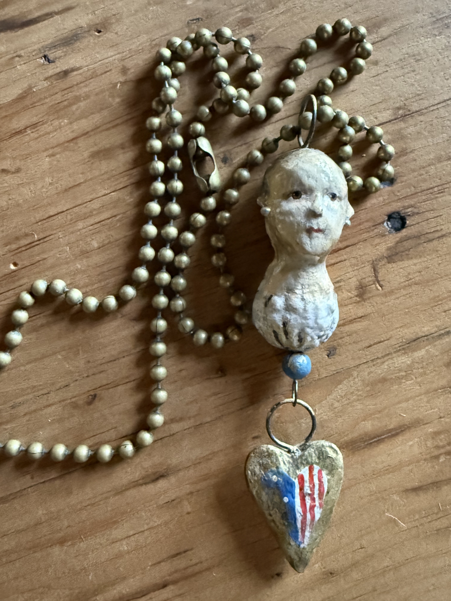 one of Debbee's most compelling pieces, a wee head of her doll with a heart pendant, about 4", hand molded and hand painted, hangs from a ball chain... can be worn or hung in display... a rare find... shown with other pieces of the collection available separately -- only one in stock, the one shown is the item you will receive...