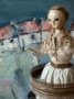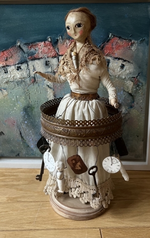 An exquisite peddler doll, utterly laden with exquisite detail. A one of a kind art doll created by artist Nicole Sayre, this lovely hand made creation measures about 15” tall dressed in a fine frock of antique fabrics with innumerable details, her peddlong skirt is festooned with antique, found, and vintage oddities and items.