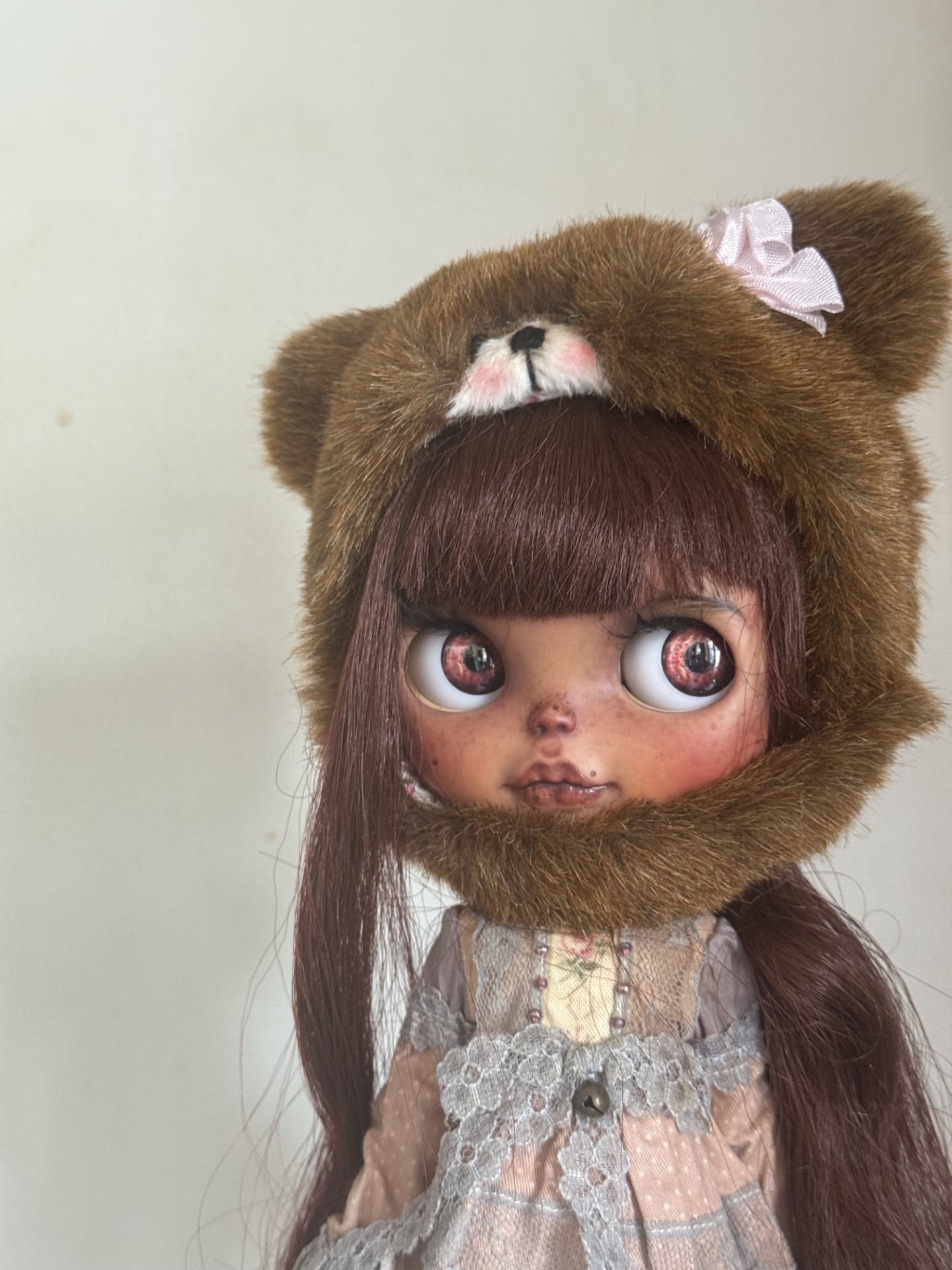 she is truly darling ...this doll has been customized by Blue Mountain Blythes...she is on a stock Takara base "Suri Sustainable" with the incredible style of artist Sam Moodie Raley of Blue Mountain Blythes. A full face-up with pastels, watercolor pencils and professional acrylic colors (fixed with MSC UV CUT) carving of nose, eyes and philtrum, custom eyelids, new eyelashes, sleep eyes, with new custom pull ring, boggled eyes with gaze correction, and four pairs of custom eyechips. The backplate is signed by the artist. She will travel in the lovely outfit she is wearing -- inclduing her wonderful Sweet Days Custom teddy helmet -- with a custom stand and some fun extras.... Earth Angels Studios proudly represents this artist on an exclsuive basis.