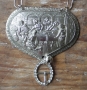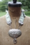 fabulous one of a kind assembled necklace created by Melody Elizabeth blends found objects, vintage ribbons and jewelry findings, a statement piece that can be worn to the wearer's taste in lengths from 18-22" as necklace adjusts by buckle fastener, pendant measures approx 3x3.5, a large and chunky piece appointed with delicate details, WAS $125, NOW on SALE...