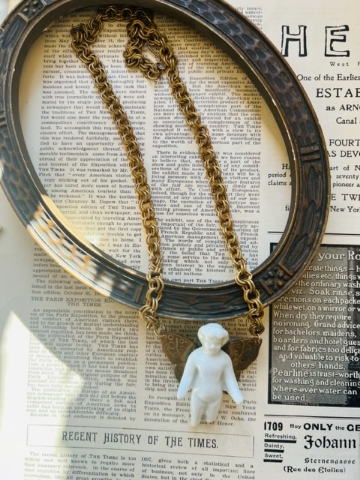 Wearable altered art pendant created with a melange of found and vintage objects, antique findings convey texture and style, a 2.25" pendant hangs from an 20" chain, overall length measures 20.25” created by artist Dara DiMagno, singular in style and story, her work has been featured by Country Living, Romantic Homes and Where Women Create Magazines, WAS $165, NOW featured as a SALE item…
