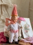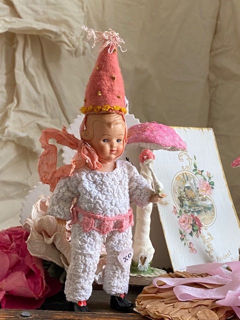 a 6" dolly the artist calls an "Emme" doll --  a vintage doll c1960s redressed by the artist in found and vintage fabrics and adorned with vintage trims, millinery and more loving details... she wears a hand felted party hat and carries a wee spun cotton mushroom