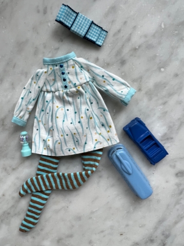 A curated outfit for your Blythe doll -- or other 1:6 dolls -- from “Style to Go”…totally adorable fashion from head to toe from some of our favorite designers and makers. This ooak ensemble features the attire shown in the photo... a duet of vintage toys, hair accessory, gumball machine, dress, tights