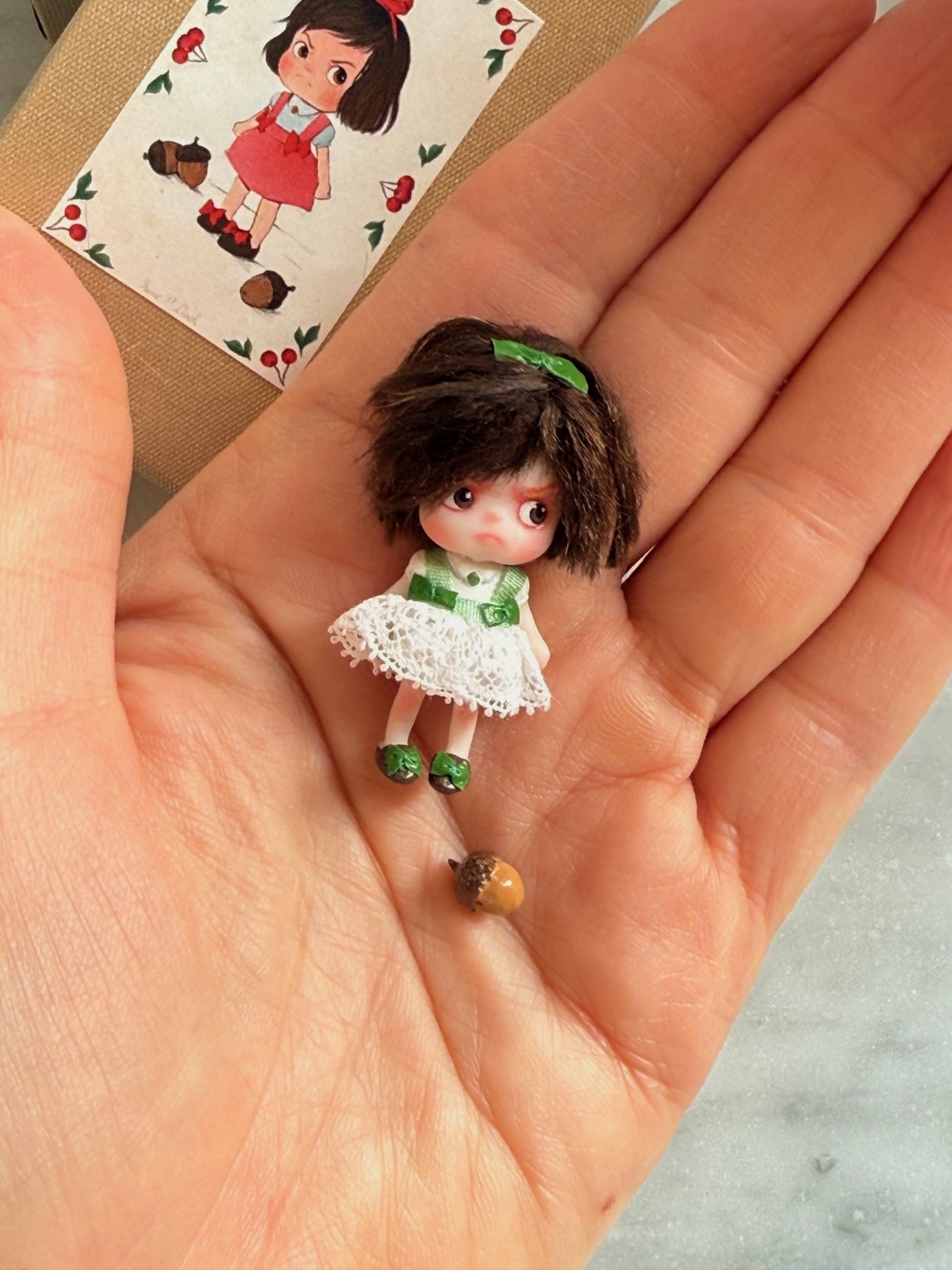 a spectacular piece of miniature art -- so much expression in the tiniest form. just the most wonderful and oh so tiny doll, hand molded and painted and dressed in dainty lace, this doll is ooak mini by artist Irene PB. ... a darling treat and wonderful wee accessory for your fave Blythe too, includes tiny acron and illustrated box