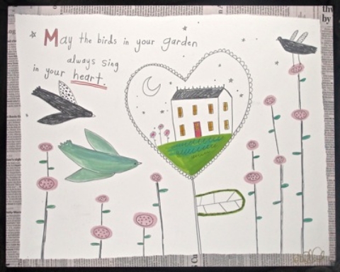 Original mixed-media painting by artist Deirdre Friebely, created with graphite, gouache and oil pastel on illustration board. Mounted on gallery wrap canvas, finished with the daily news and ephemera, sealed and preserved with varnish for a lustrous finish, measures 16x20.