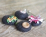 A collection of hand felted wool medallions hang from a steel kilt pin, sewn and beaded together, this pin is like a mini quilt, adorned with appliqued flowers, ribbons, trims, and buttons, note that the reverse showcases a collection of iridescent Abalone buttons (many customers wear this pin in reverse) measures 2.5"x2.75", WAS $58 NOW on SALE...