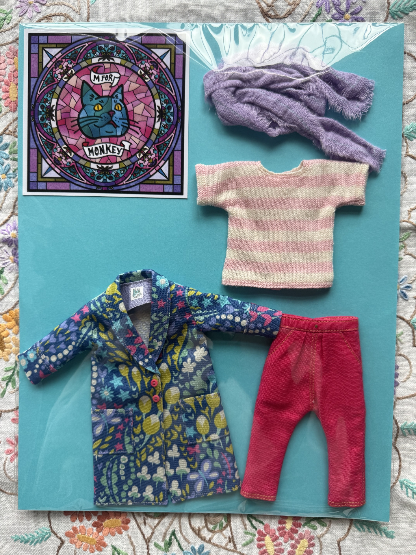 a special 4 piece set of coat, pants, blouse and scarf, we are thrilled to present ths offering at the gallery...a wonderful set for your Neo Blythe dolls, exceptionally sewn and wrougt with curated fabrics and exquisite detail, created by renown dolls couturier M for Monkey for Earth Angels Studios by special arrangement...