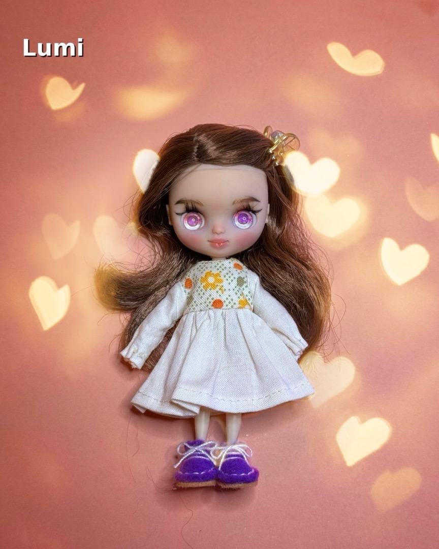 ...someting new and special from SplatterGirl... Meet "Rumi". She's a tiny traveller ready to accompany you on your adventures-- she can be joyful in display or accompnay you on your outings grand and small in her sturdy tin windowed case. Hand-painted, with a unique face-up and charming details that make her one-of-a-kind -- like her dainty purse and adorable curls -- winsome and sweet, she's lovely and measures about 4".