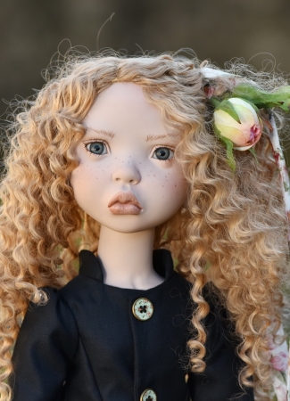 an exquisite new girl in the artist's BJD series... so compelling... created in PORCELAIN vinyl -- A fabulous new doll from talented artist Nicole Marschollek-Menzner of Zwergnase Dolls. She is an edition of just 25 dolls with a fullly moveable, 11 piece vinyl body. A wonderfully curly and lush wig tops her head, and she has hand-blown glass eyes from the renown makers in Lauscha, Germany. Lovely real leather shoes and all manner of lovingly appointed and well tailored details. Made in Germany. Signed hang tag and emblem branded box with branded couture ribbons...if you would like to arrange a layaway email Jen@EarthAngelsStudios.com... she will be delayed in shipping as she will be ordered for you -