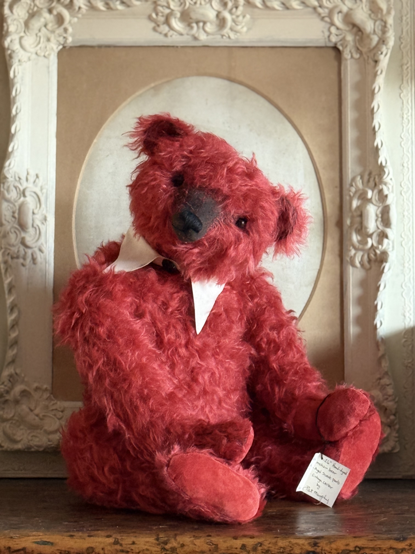 An amazingly bear... and among the largest the artist has created, a grand 26" art bear by renown American teddy bear artist, Pat Murphy of Murphy Bears. A fabulous hand dyed cheery chery red bear -- this color has so much depth in the dense, deep aged curly mohair. He wears a vintage shirt collar with snazzy black vintage button button. He has suede paw pads, and he is fully jointed with so much style...this chap exudes dashing charm...