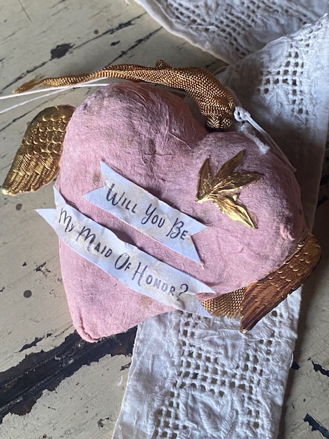 ...a hand spun cotton batting ornament by artist Sophie Boutel festooned with paint, vintage embellishments, ephemera, vintage textiles, and a touch of magic. About 3"..Labeled with a charming hand tag and packaged in a box befitting a treasured keepsake or for gifting - ONLY ONE AVAILABLE